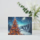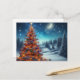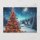 This design features a beautifully, illuminated Christmas tree covered in snow, sparkling with warm lights and vibrant red and green ornaments, under a starry sky and a crescent moon.