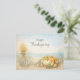 This unique Thanksgiving design blends classic harvest elements with a serene coastal setting. Ivory and orange pumpkins rest among corn, pears, apples, acorns, and autumn leaves, while seashells, starfish, coral shapes, and soft ocean tones create a beach-inspired backdrop. A bundle of golden wheat tied with rope adds rustic charm, complementing the sandy textured background and gentle blue sky. The graceful “Happy Thanksgiving” lettering sits above the arrangement, bringing balance to the composition. Warm golds and soft neutrals contrast beautifully with cool coastal blues, offering a fresh seaside twist on traditional autumn harvest imagery.
