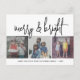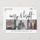DISEÑO FRONTAL: 3 fotos cuadradas y una gran fuente de guiones son los aspectos más destacados de este diseño de moda. Un estilo moderno para una tarjeta de fotos de vacaciones con un gran "alegre y brillante" en un original tipo de letra manuscrita en blanco y negro. Para usuarios avanzados, puede ir al área de diseño y cambiar los colores. El fondo es blanco. Debajo del collage de imágenes hay un área para un saludo y una firma familiar.