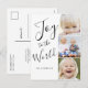 Personaliza este diseño moderno de letras a mano con la palabra "Alegría al mundo" en negro y blanco. Una tarjeta de vacaciones moderna y sencilla con foto. Elke Clarke ©