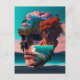 A skull head has been completely colored in an abstract style to bring you into the world of creativity and surreal design, in the style of photo-realistic landscapes, tropical landscapes, futuristic realism, pixelated realism, light crimson and sky-blue, surrealistic dreamscapes