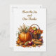 Esta tarjeta postal del Día de Acción de Gracias muestra una ilustración digital de acuarela de manzanas de cosecha y una calabaza madura. La parte delantera presenta el texto "Comparte la alegría y da gracias", mientras que la parte trasera incluye el saludo: "Deseándote a ti y a los tuyos un hermoso Día de Acción de Gracias. Uno que esté lleno de recuerdos felices de familia, comida y amor". Como plantilla, esta tarjeta permite la personalización para adaptarse a las preferencias individuales de las fiestas. Arte de IA diseñado por Susang6.