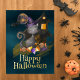 ¡Acepta el encanto de Halloween con nuestra tarjeta de postales de color negro "Feliz Halloween"! 🎃 🌙 💌 Esta cautivadora postal es una mezcla cautivadora de encanto y capricho de Halloween. En el fondo de una luna llena, un lindo gato negro color agua tiñe a un gorra de brujas y se sienta encima de un montón de dulces coloridos. Arriba, un murciélago sale volando por el cielo iluminado por la luna. El mensaje "Halloween feliz" está orgullosamente impreso para anunciar tu espíritu de Halloween. Envíe sus deseos de Halloween con una sonrisa y una ramificación de encanto espeluznante. Prepárate para encantar la temporada con esta encantadora postal. 🌟 🍬 👻