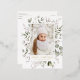 Elegante postal vacacional con tu foto vertical enmarcada en blanco con un fondo de nevadas acuáticas, hojaldre, hojas de eucalipto y follaje verde de sabio exuberante. Personalice la parte delantera de la postal de los Navidades botánicos con un saludo personalizado y su apellido en letras de Relieve metalizado dorado. La tarjeta postal de vacaciones de Relieve metalizado se revierte para mostrar su dirección de retorno y el mensaje de personalizado