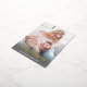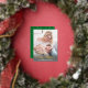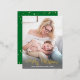 Fancy "Feliz Navidad" delante en Relieve metalizado de oro con Relieve metalizado de oro. Añade tu foto, nombre, año y mensaje al dorso. Back tiene texto de guión dorado y estrellas doradas en fondo verde profundo.