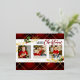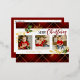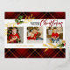 Hermoso y festivo diseño de vacaciones con hojas de Relieve metalizado de oro reales, gráfico de texto "Feliz Navidad" hueco y personalizado en banner blanco con borde dorado, plantilla de 3 fotos con rico fondo rojo, negro y dorado tartán. Incluye campos de texto editables en la parte delantera y posterior.