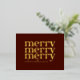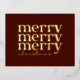 Esta postal festiva tiene el texto Merry, Merry, Merry y Navidades en Relieve metalizado de oro. Esta tarjeta de estilo clásico y retro le da un toque personalizado hermoso y brillante a sus saludos de temporada. (El color rojo de fondo puede cambiarse según sus preferencias, sólo vaya al área de personalización.)