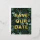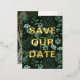 Este es un diseño moderno de 'Guardar fecha' con tipografía en negrita en lámina de oro real sobre un fondo floral verde botella. En el reverso de esta plantilla hay espacio para una foto posicionada debajo de un gradiente verde suave. Fácil de personalizar con tu información única.