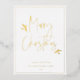 Feliz Navidad, simple escritura festiva con acentos follativos, verdadera tarjeta postal de vacaciones de Relieve metalizado de oro. La plantilla proporciona espacio para el mensaje personal de vacaciones y la dirección de retorno en la parte posterior.