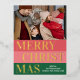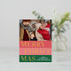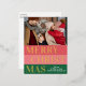Navidades de temporada de moda única, moderna y sencilla tarjeta de felicitaciones navideñas con tu fotografía de invierno favorita y Relieve metalizado de oro real MERRY CHRISTMAS texto sobre un patrón de franjas negrita color rojo coral, rosa rubor y verde del bosque. Con espacio para personalizar o personalización con una foto y nombre familiar o nombres de su elección en la parte delantera, y un poema de bienvenida de la temporada de personalizable en el reverso de la tarjeta, incluyendo su dirección de retorno, ciudad, código postal y estado.