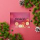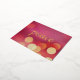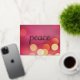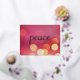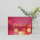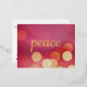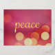 Una tarjeta elegante con un atractivo atemporal. Un simple mensaje de paz en la tipografía con guión de Relieve metalizado dorado contra un fondo de arándano rojo con baudias de luz dorada o luces de bokeh. Personalizar tu mensaje, saludo y nombre de la empresa en la parte posterior de la postal. Un sentimiento encantador para las vacaciones.