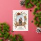 Crema natural, negro, terracota y verde salvia floral botánico elegante ciervo floral tarjeta postal de vacaciones de Navidad con presupuesto. Detalles de tipografía de oro, plata y rosa real auténticos.