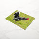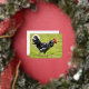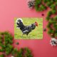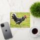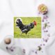 Postal Festiva Con Relieve Metalizado Rooster blanco y negro caminando sobre la hierba