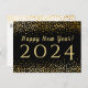 Las tarjetas postales son una excelente manera de desear a su familia y amigos un Feliz Año Nuevo. Este diseño presenta un fondo negro con confeti de oro falso espolvoreado encima y debajo de las palabras "¡Feliz Año Nuevo! 2019". La parte posterior de la tarjeta postal tiene un espolvoreo de confeti dorado a lo largo de la parte superior. Tiene un saludo, mensaje y firma para personalizar. Diseñado por el artista © Susan Coffey. Fotografía © Storytree Studios, Stanford, CA.
