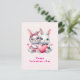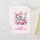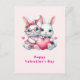 Valentine's Day postcard with an illustration featuring 2 white furry bunnies sharing a big PINK heart. The girl bunny is wearing a cute bow on her head and heart-shaped glasses. The boy bunny is wearing an adorable little suit with a tie.