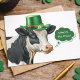 Postal del Día de San Patricio con un lindo y festivo ilustracion acuarela de una vaca blanca y negra lista para una celebración del Día de San Patricio con un sombrero top verde con una banda de oro, margarita blanca y champú verde. Texto "¿Dónde está el Craic?" en una burbuja de pensamiento verde (traducción craic = buen momento). Una roca de color agua en la esquina inferior izquierda en el reverso.