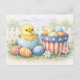 This charming watercolor postcard features a fluffy baby chick hatching from a pastel egg, surrounded by beautifully decorated Easter eggs, delicate spring flowers, and a festive basket with a subtle patriotic touch. The soft hand-painted style creates a warm, joyful feeling, making it perfect for Easter greetings, spring celebrations, or collectors of cute and whimsical art. Ideal for sending cheerful seasonal wishes or adding a sweet touch to your postcard collection.
