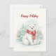Cute watercolor polar bear wearing a red scarf, sitting peacefully in the snow among pine trees and falling snowflakes. Soft pastel tones and a cozy winter feel make this charming design perfect for holiday greeting cards, Christmas wishes, and seasonal stationery.
