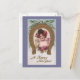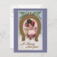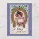 Una herradura enmarca a una mujer sosteniendo una copa de champán en esta tarjeta postal vintage del Día de Año Nuevo de 1908. La herradura lleva las palabras "Buena suerte" y "1 de enero" y encima hay ramas de pino. Hay rosas en el cabello y el corpiño de la dama.