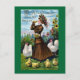 Una mujer con un vestido marrón y una gorra plumada, tiene una canasta de huevos en el brazo y sostiene una chica en la cara. Una gallina, un gallo y cuatro chicas más están a sus pies y en el fondo están hollyhocks y girasoles en esta vintage postal de Pascua de 1909.