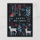 Diseño minimalista de tarjeta de vacaciones con un tema inspirado en Escandinavia. La tarjeta presenta una paleta de colores simple de azul marino y rojo, con ilustraciones intrincadas y estilizadas de flora y fauna, incluyendo pájaros, ciervos, hojas y plantas abstractas, dispuestas en una composición armoniosa y equilibrada alrededor de un cuadro de texto central. El cuadro central tiene una fuente limpia y moderna con el mensaje "Felices Fiestas". El diseño evoca un ambiente natural y festivo con detalles elegantes y dibujados a mano, capturando una estética moderna y atemporal. Mensaje de vacaciones editable en la parte posterior.