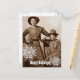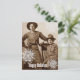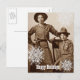 Foto antigua de dos mujeres del viejo oeste. Una está sentada y la otra está de pie. Ambas tienen faldas con flecos y llevan sombreros. Una tiene un arma en una funda en la cintura. Tres copos de nieve blancos y un saludo de Navidad personalizable.