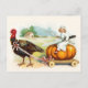 Postal de Acción de Gracias de estilo cutáneo que muestra a un joven chef montado en un vagón de calabaza, que es tirado por un pavo. Imágenes de HTM
