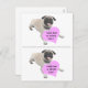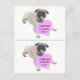 El frente de esta tarjeta posteada tiene una foto digital de un Pug sosteniendo un corazón rosado. ¡El texto en el corazón es personalizable! Corta la línea de corte punteada y tendrás 2 tarjetas de San Valentín por el precio de 1. El reverso de esta tarjeta está en blanco para su comodidad. Compra estos a granel - ¡hacen excelentes tarjetas de San Valentín para la escuela!