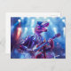 Un dinosaurio actúa en el escenario en cuero con una guitarra: energía prehistórica de rock 'n' roll.