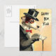 Ilustracion vintage de un perro con sombrero superior, chaqueta de esmoquin y bastón. También está fumando un cigarrillo. Tarjeta interna "Feliz Año Nuevo". La postal muestra deseos a un lado