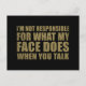 Si te gustan las citas sarcásticas divertidas o los grandes diseños humorísticos, este lema original "No soy responsable de lo que mi cara hace cuando hablas" es para ti. ¡Es un gran regalo para tu familia, amigos o para ti mismo! Este diseño es ideal para todo aquel que ame el sarcasmo y el humor. Si te gusta esta cita graciosa, echa un vistazo a otras obras similares en la tienda Omitay. Mantente a salvo y gracias por apoyar a un artista local.