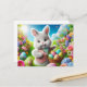 Cute, fluffy white bunny is surrounded by a vibrant spring meadow filled with colorful flowers and beautifully decorated Easter eggs.