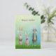 Wish Happy Easter to friends and family with this adorable image of three bunnies, two of which are holding Easter eggs. Each bunny has a different expression on their face and cute eyes. The rabbits are standing on tall green grass with a pale green and blue background. The text says "Happy Easter".