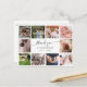 Una hermosa y moderna tarjeta postal cuadrada de fotos perfecta para agradecer a los invitados de la ducha de bebé por los regalos, el amor y el apoyo recibido. El diseño moderno incluye un collage de fotos de 10 personalizables cuadrados. En el centro hay un mensaje de "gracias" en un guión caprichoso de moda y el nombre y fecha de nacimiento de su bebé, con elegantes letras clásicas. En la parte de atrás está tu mensaje de agradecimiento de personalizable. A través del botón "personalización" se pueden reemplazar las fotos y cambiar el texto.
