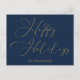 Un elegante guión de caligrafía de efecto de oro de Happy Holidays adornado con corazones sobre un sofisticado fondo de azul profundo. La parte trasera de la tarjeta tiene una rociada de estrellas doradas sobre un fondo azul profundo. Presione el botón personalizar para agregar su nombre de familia o nombres individuales, y difunda algunas alegrías de vacaciones.