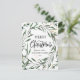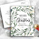 Elegante Dorado Confetti Pino Foliage Watercolor Greenery Moderna Tarjeta De Vacaciones Elegante De Estilo Guión. Envíe saludos de vacaciones a amigos y familia en un diseño simple, moda, elegante y moderno sin foto, festivo, natural color de la naturaleza estilo tarjetas de vacaciones cuadradas! Un bonito marco de corona de hojas de acuarela de color verde suave, rodeado de copos de confeti dorado en la parte delantera. El centro presenta el saludo "Feliz Navidad" en una tipografía con letras a mano, con tu mensaje personalizado, nombres y el año por debajo.