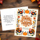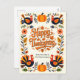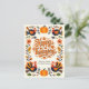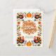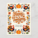 Envíe un pequeño artículo directamente al buzón con esta postal de Acción de Gracias personalizable. El frente cuenta con una frontera de arte folclórico con encantadores pavos y calabazas de plumas, todo ello bailando entre una cascada de hojas de otoño. La pieza central, "Happy Thanksgiving" se presenta con un tierno estilo retro y cálido que se siente tan acogedor como un suéter otoñal favorito. La parte trasera ofrece un espacio generoso para su mensaje y dirección personalizados, lo que la convierte en una manera perfecta de compartir gratitud con clientes, familiares o amigos.