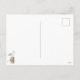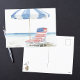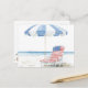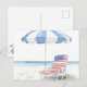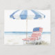Tarjeta postal patriótica roja, blanca y azul con una silla de playa clásica cubierta con la bandera estadounidense junto a una sombrilla azul y blanca ventilada, esta escena serena combina perfectamente la relajación veraniega con el orgullo patriótico. Una ilustración de una gaviota posada sobre un pilote de madera desgastado que se muestra en el reverso.