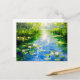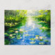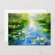Piscina de verano tranquila con nenúfares blancos en flor, suaves reflejos del cielo y árboles de alrededor. Un estilo impresionista suave con verduras vibrantes y luz natural.
