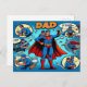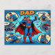 Un diseño inspirado en un superhéroe que representa a los papás como los héroes supremos, con ilustraciones de padres al estilo de las historietas interpretando proezas cotidianas de superhéroes.