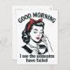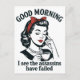 El humor negro encuentra el encanto retro con esta ingeniosa cita matutina: "Buenos días, veo que los asesinos han fracasado". Perfecto para los amantes del café y para aquellos que disfrutan de un comienzo del día con sarcasmo.