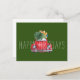 Felices Fiestas texto personalizable con coche rojo estilo acuarela con escarabajo, coronado con árbol de Navidad y regalos sobre fondo verde oscuro