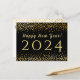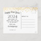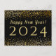 Las tarjetas postales son una excelente manera de desear a su familia y amigos un Feliz Año Nuevo. Este diseño presenta un fondo negro con confeti dorado falso espolvoreado encima y debajo de las palabras "¡Feliz Año Nuevo! 2019". La parte posterior de la tarjeta postal tiene un espolvoreo de confeti dorado a lo largo de la parte superior. Tiene un saludo, mensaje y firma para personalizar. Diseñado por la artista © Susan Coffey. Fotografía © Storytree Studios, Stanford, CA.