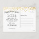 Las tarjetas postales son una excelente manera de desear a su familia y amigos un Feliz Año Nuevo. Este diseño presenta un fondo negro con confeti de oro falso espolvoreado encima y debajo de las palabras "¡Feliz Año Nuevo! 2019". La parte posterior de la tarjeta postal tiene un espolvoreo de confeti dorado a lo largo de la parte superior. Tiene un saludo, mensaje y firma para personalizar. Diseñado por el artista © Susan Coffey. Fotografía © Storytree Studios, Stanford, CA.