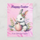 Aprovecha la alegría de Pascua con nuestra deliciosa tarjeta de vacaciones "Happy Easter" de Bunny Painting Egg. Con un suave fondo rosa adornado con delicadas hojas rosadas, esta carta exuda una encantadora atmósfera primaveral. El texto morado le da un toque de elegancia al saludo, complementando perfectamente el fondo. En el centro, un bonito conejito blanco, adornado con una flor al lado de la oreja, pinta alegremente un vibrante huevo rojo de Pascua con un pincel. Esta escena capta la esencia de la festividad y seguro traerá sonrisas a los rostros de sus seres queridos. Envíe sus más cálidos deseos de Pascua con nuestra feliz tarjeta de vacaciones de huevo de pintura para conejitos de Pascua.