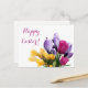 Postal Festiva Feliz Pascua morado crocus amarillo tulipán rosa l