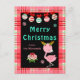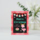 This cute and fun holiday postcard can be personalized with a family name or title. It features an adorable flamingo in reindeer antlers on a pink and red plaid background. The text combines sans serif fonts for a stylish and modern look. Winter snowflakes and patterned baubles add a festive touch.