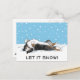 Postal de vacaciones. "¡Que nieve!" El texto se puede personalizar con tu propio mensaje. Dibujo de un perro pastelero de Shetland rodando en la nieve con copos de nieve cayendo. Una postal perfecta para Navidades para servicios mascotas al personalizar y enviar a clientes, amigos y clientes. Excelente para veterinarios, mascotas y caminantes de perros. Visita el Doodle World de Jenn para ver más productos con este diseño de perro feliz, así como más tarjetas de Navidad y regalos de raza de perro.