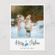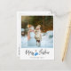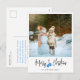 Tarjeta postal de vacaciones de Navidad moderna con una foto grande, letra de caligrafía, guantes azules y mensaje personalizado.