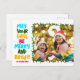 Postales de vacaciones familiares agradables y alegres con una colorida cadena de luces de Navidades envueltas alrededor de la fotografía de tus hijos. Que tus días sean amargos y brillantes escritos en negrita, de azul claro a tu apellido de rosa caliente. Un arcoiris de colores para las vacaciones.